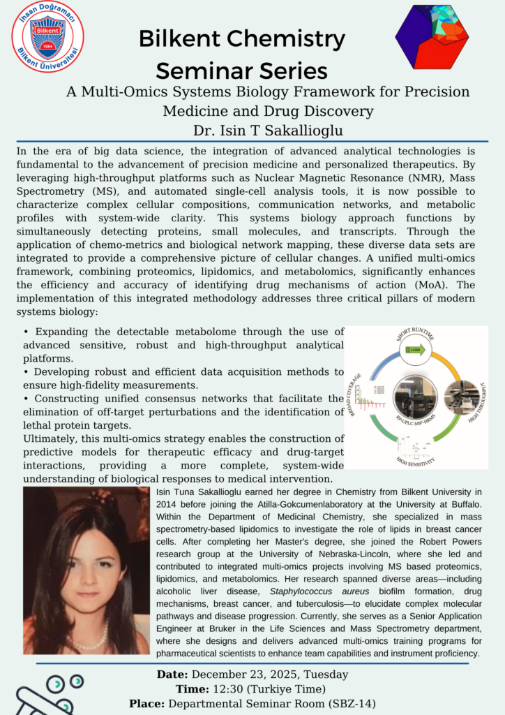 Dr. Isin Tuna Sakallioglu earned her degree in Chemistry from Bilkent University in 2014 before joining the Atilla-Gokcumen laboratory at the University at Buffalo. Within the Department of Medicinal Chemistry, she specialized in mass spectrometry-based lipidomics to investigate the role of lipids in breast cancer cells. After completing her Master’s degree, she joined the Robert Powers research group at the University of Nebraska-Lincoln, where she led and contributed to integrated multi-omics projects involving MS based proteomics, lipidomics, and metabolomics. Her research spanned diverse areas—including alcoholic liver disease, Staphylococcus aureus biofilm formation, drug mechanisms, breast cancer, and tuberculosis—to elucidate complex molecular pathways and disease progression. Currently, she serves as a Senior Application Engineer at Bruker in the Life Sciences and Mass Spectrometry department, where she designs and delivers advanced multi-omics training programs for pharmaceutical scientists to enhance team capabilities and instrument proficiency.
