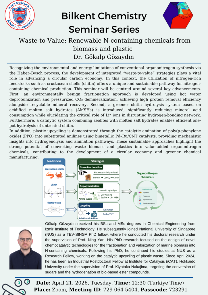 This seminar will be centred around several key advancements. First, an environmentally benign fractionation approach is developed using hot water deproteinization and pressurized CO₂ demineralization, achieving high protein removal efficiency alongside recyclable mineral recovery. Second, a greener chitin hydrolysis system based on acidified molten salt hydrates (AMSHs) is introduced, significantly reducing mineral acid consumption while elucidating the critical role of Li⁺ ions in disrupting hydrogen-bonding network. Furthermore, a catalytic system combining zeolites with molten salt hydrates enables efficient one-pot hydrolysis of untreated chitin.
